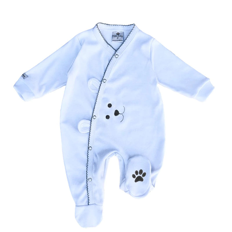Esses macacões possuem fechamento por botões, facilitando a troca de fraldas.