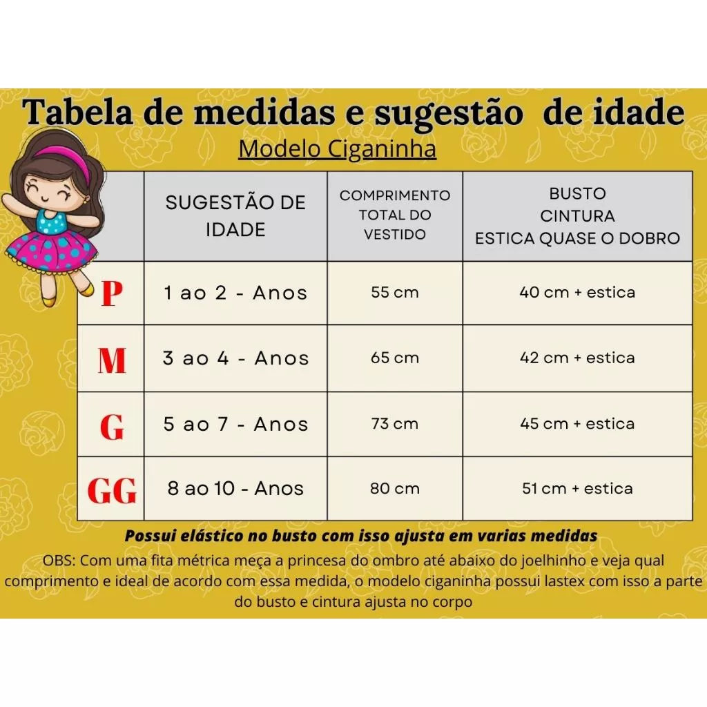 O modelo ciganinha possui elástico látex em todo o busto e costas para melhor ajuste no corpo da criança - Tecido 92% Poliéster 8% Elastano digitalizado, ou seja, vestido com estampa que não sai - Não possui forro interno - Roupa de menina chique e delicada.